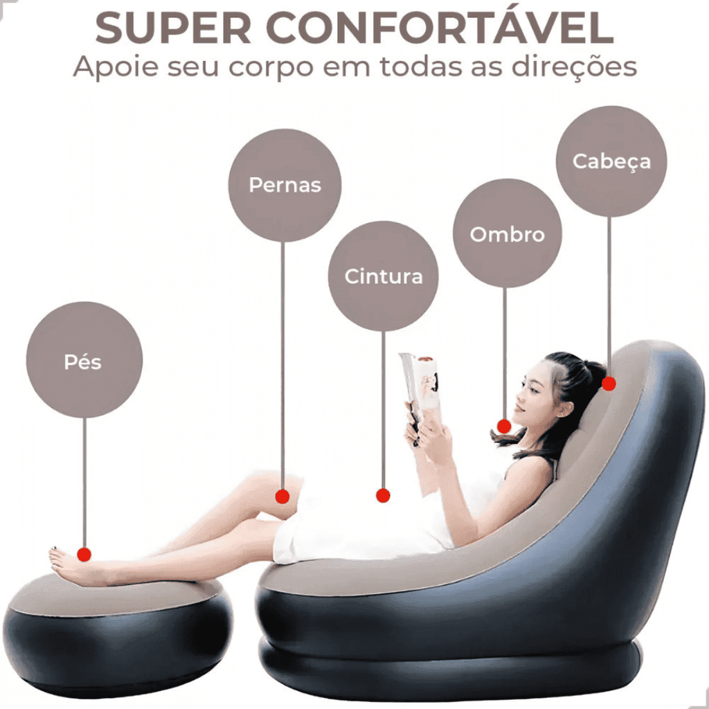 Relaxe com Estilo e Conforto em Qualquer Lugar! Transforme seus momentos de descanso com a Poltrona e Puff Inflável Descanso Preguiçoso, a combinação perfeita de praticidade e design moderno.