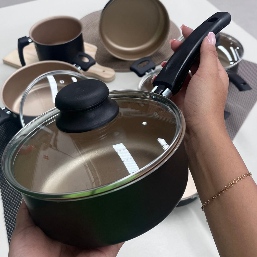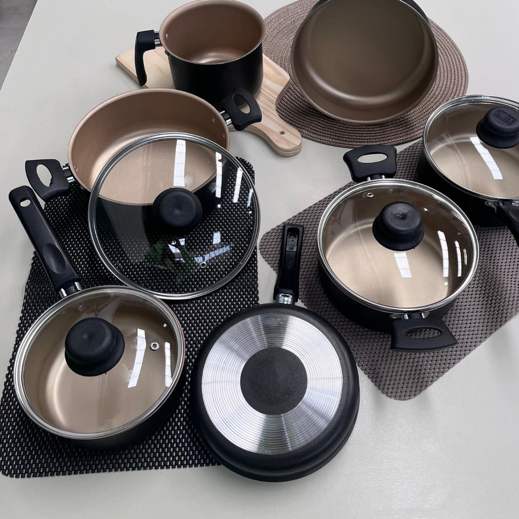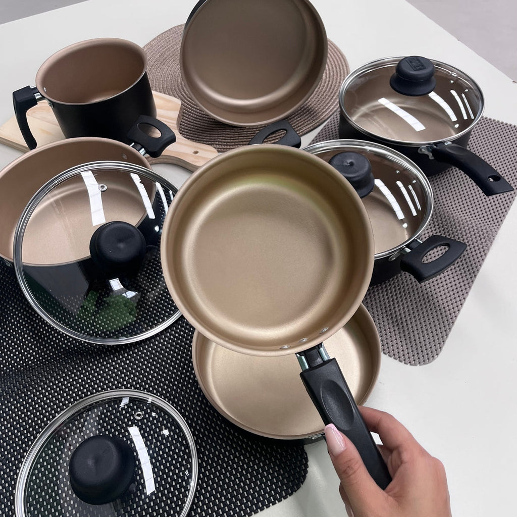 Conjunto Trofa - 10 peças, para deixar sua cozinha mais moderna e prática, com ótimo custo-benefício. Todas as panelas possuem 5 camadas de revestimento antiaderente e espessura de 1,2 mm, proporcionando um cozimento uniforme e durabilidade. Tampas de vidro temperado com saída de vapor permitem visibilidade total durante o preparo das receitas. Pegadores em baquelite antitérmico oferecem segurança e conforto. Limpeza simplificada graças ao revestimento antiaderente de alta qualidade.