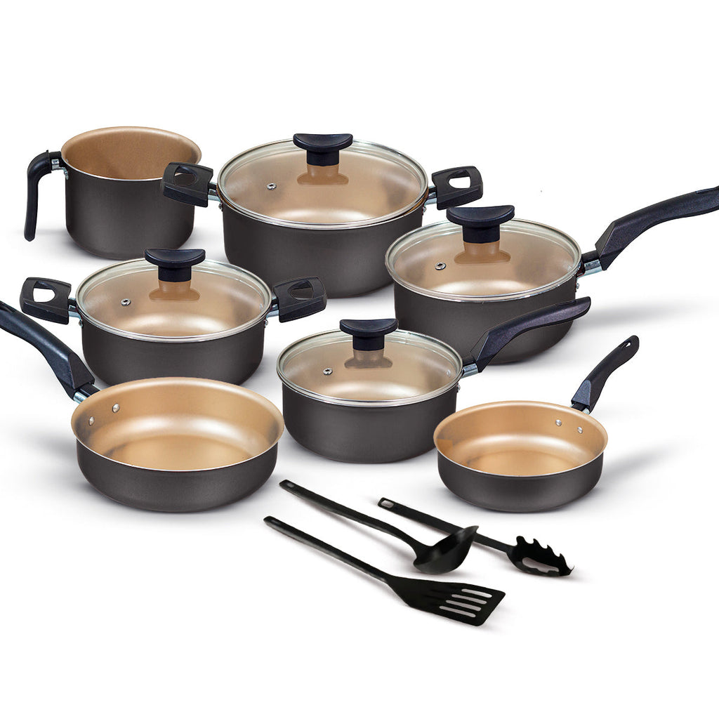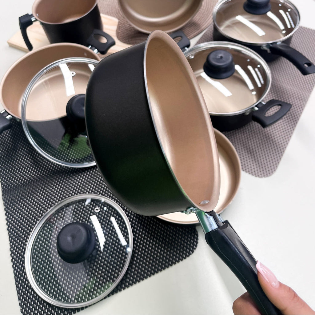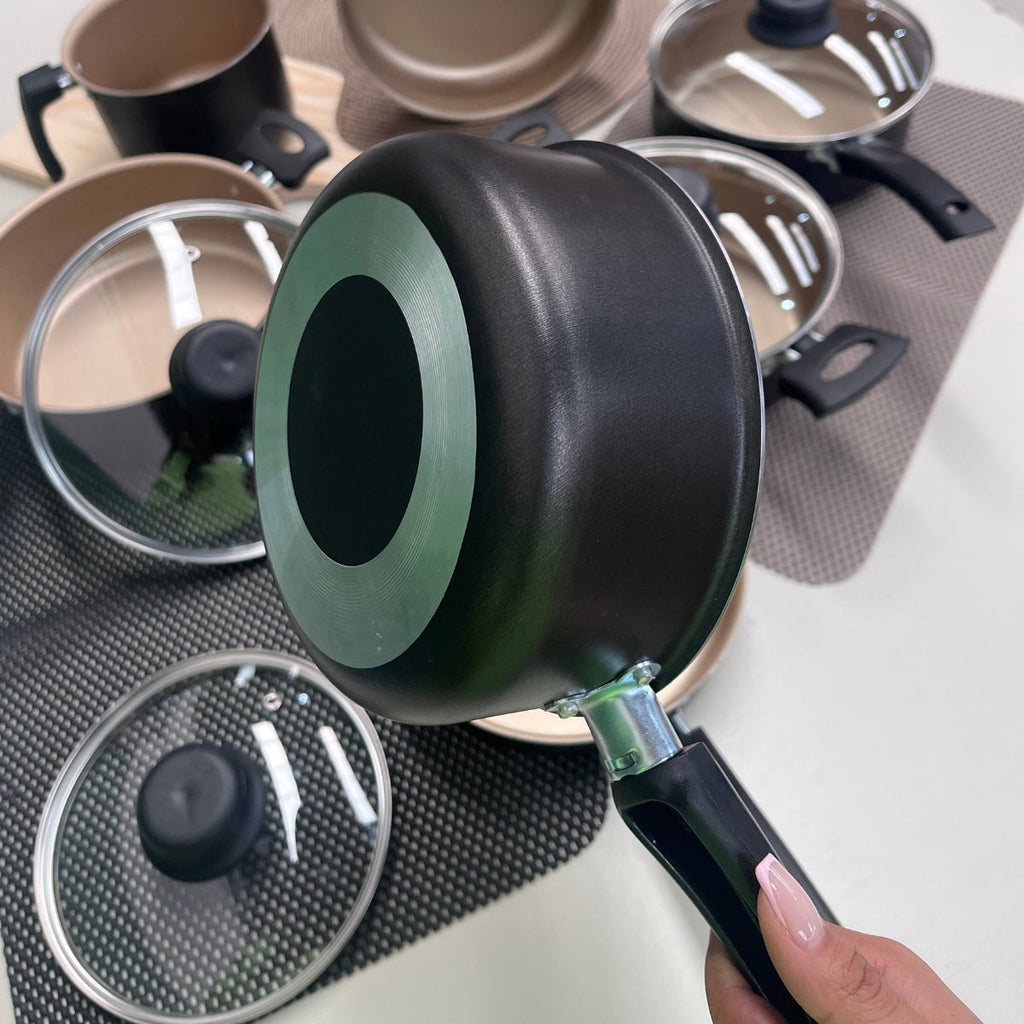 Conjunto Trofa - 10 peças, para deixar sua cozinha mais moderna e prática, com ótimo custo-benefício. Todas as panelas possuem 5 camadas de revestimento antiaderente e espessura de 1,2 mm, proporcionando um cozimento uniforme e durabilidade. Tampas de vidro temperado com saída de vapor permitem visibilidade total durante o preparo das receitas. Pegadores em baquelite antitérmico oferecem segurança e conforto. Limpeza simplificada graças ao revestimento antiaderente de alta qualidade.