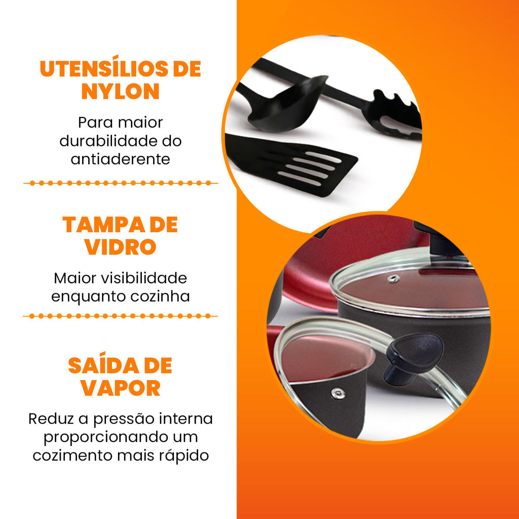 - Acompanha acessórios em Nylon, que prolongam a durabilidade do antiaderente ao evitar riscos nas superfícies.