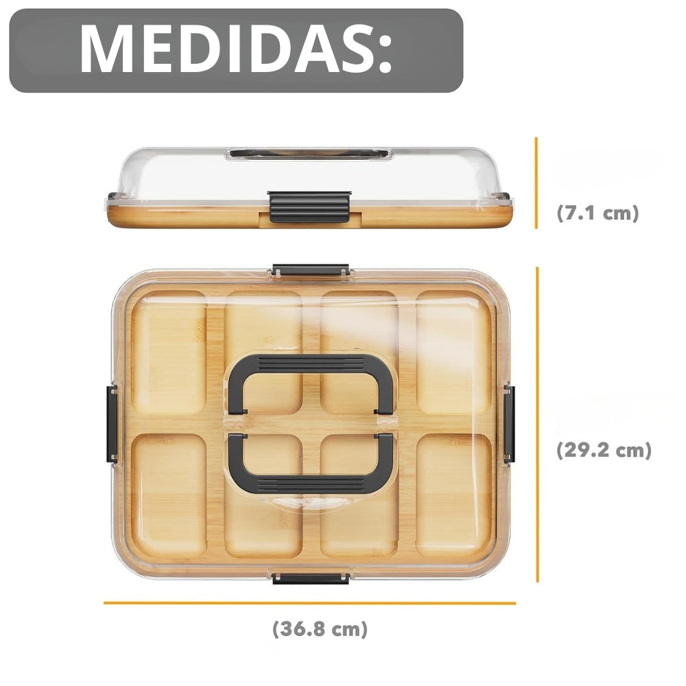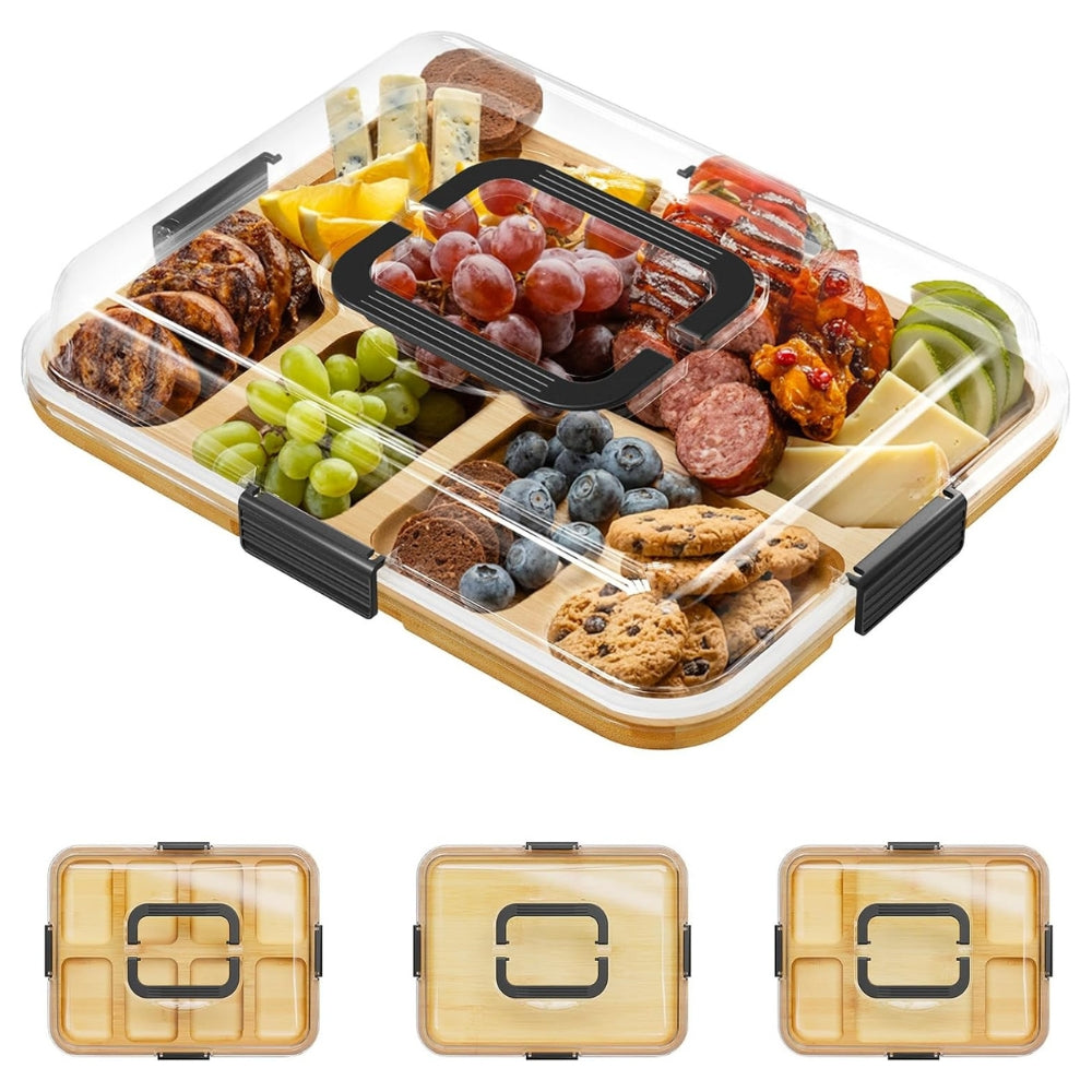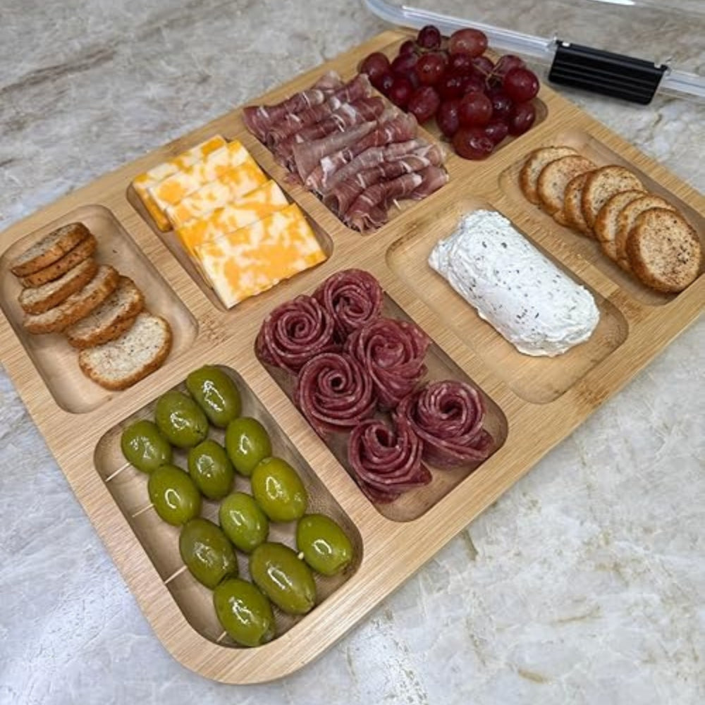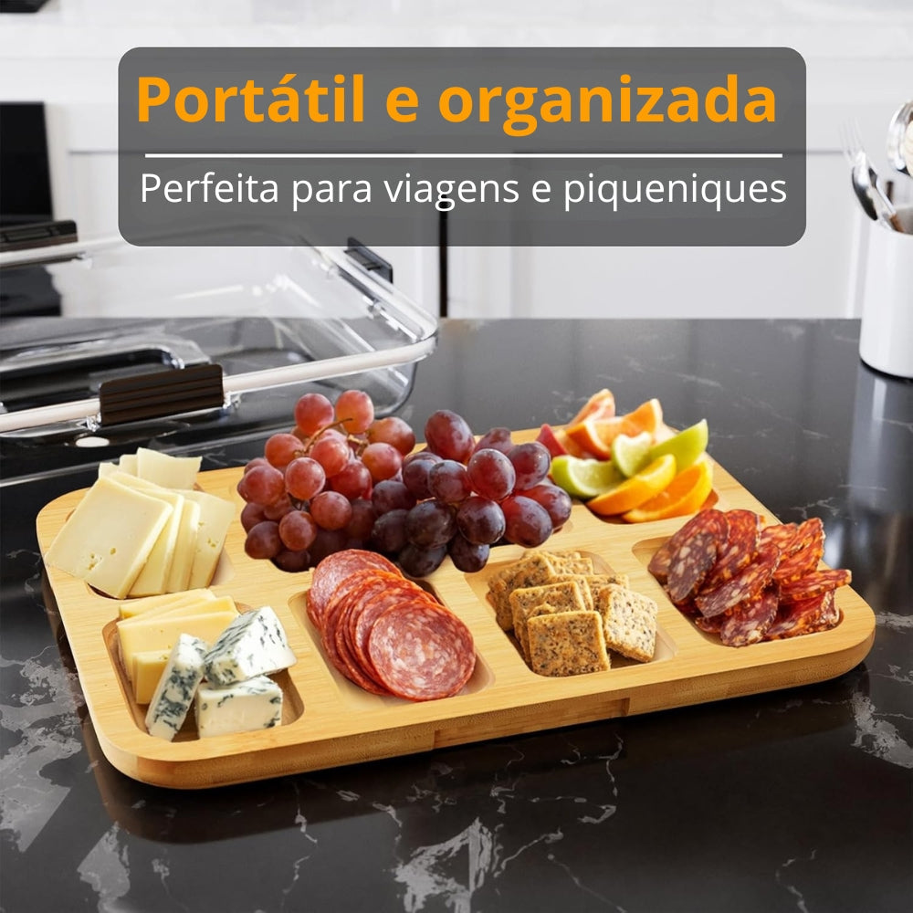 8 compartimentos integrados — organize queijos, frutas, frios, nozes e muito mais de forma elegante e prática.