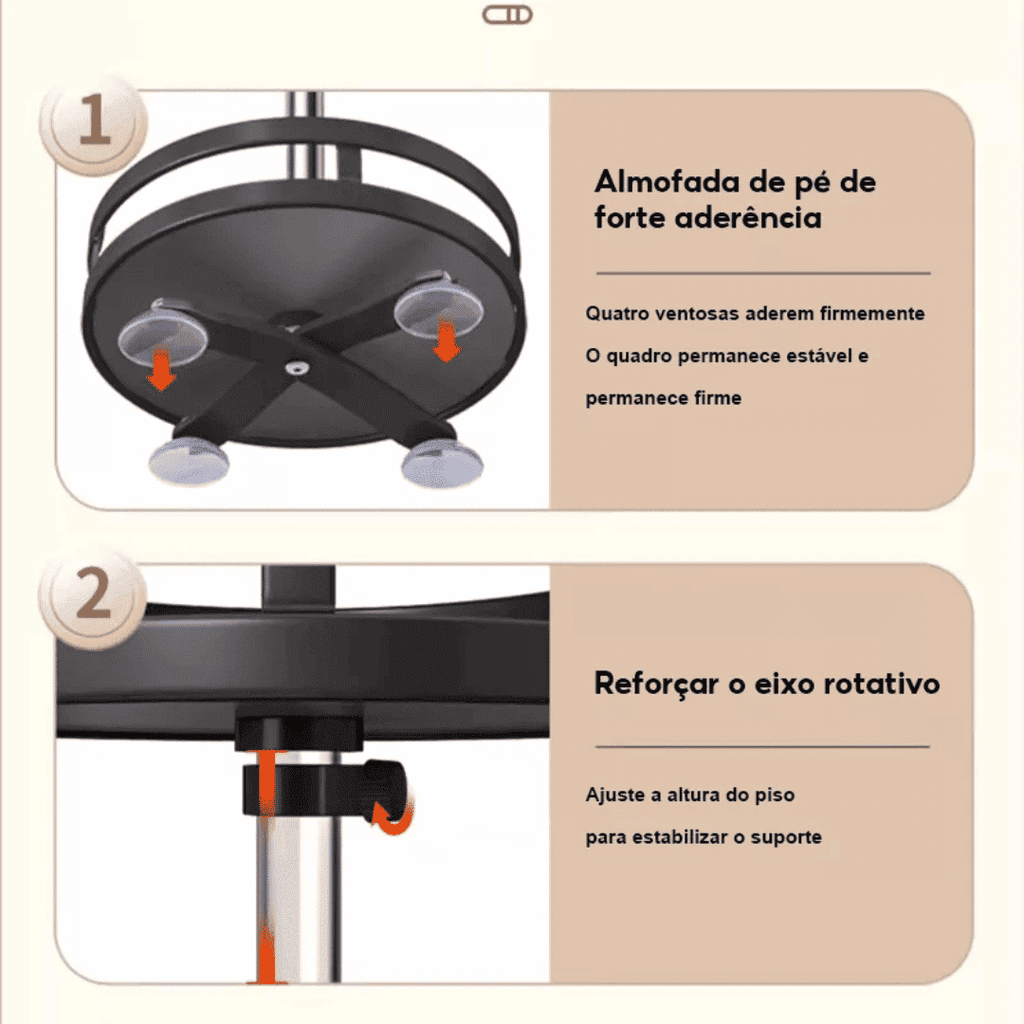 - Base Antiderrapante: Almofadas com ventosa que oferecem firmeza e distribuição uniforme do peso.